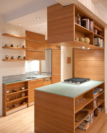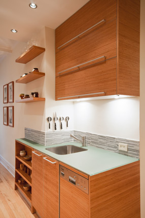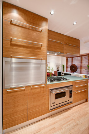 The third stage involved the complete renovation of the kitchen. A wall separating the original small kitchen from the living room was removed. Great care was taken in selecting the materials and veneer for the new kitchen cabinets. They were custom-built using bamboo plywood and finished with clear lacquer spray finish.