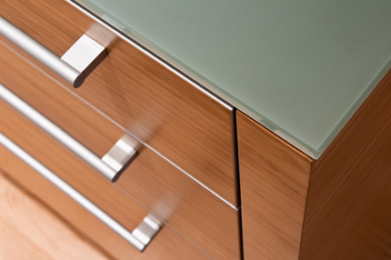 The installation of an under-mounted sink and a cook top in the glass countertops required the creation of precisely cut openings in the glass surface. Water jet cutting was used to achieve this precision. The glass was back-painted to obtain the desired color and look.