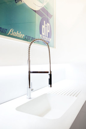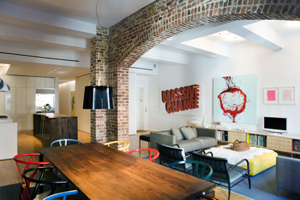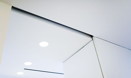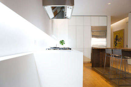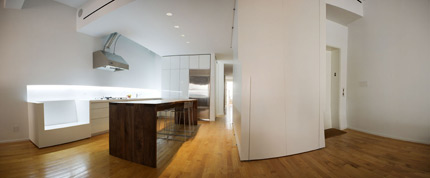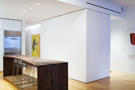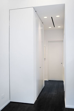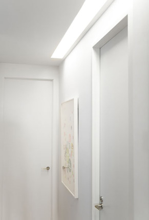 The client's love of minimalistic lines was accommodated by creating a series of seamless transitions throughout the space. A long ceiling cove was built along the length of the main hallway. Completely recessed light fixtures were installed to allow only indirect light to wash down the long walls. Continuous minimal baseboard was inserted into the door casings and appears to be disappearing into the ceiling cove. Throughout the entire loft, we used recessed trimless light fixtures and trimless air outlets in the ceiling and walls.