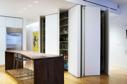 Oversized custom-built sliding doors were installed in the master bedroom and office using hardware completely recessed into the ceiling. To eliminate the door jambs for the new walk-in closets and pantry, all floor to ceiling doors where installed on pivot hinges.